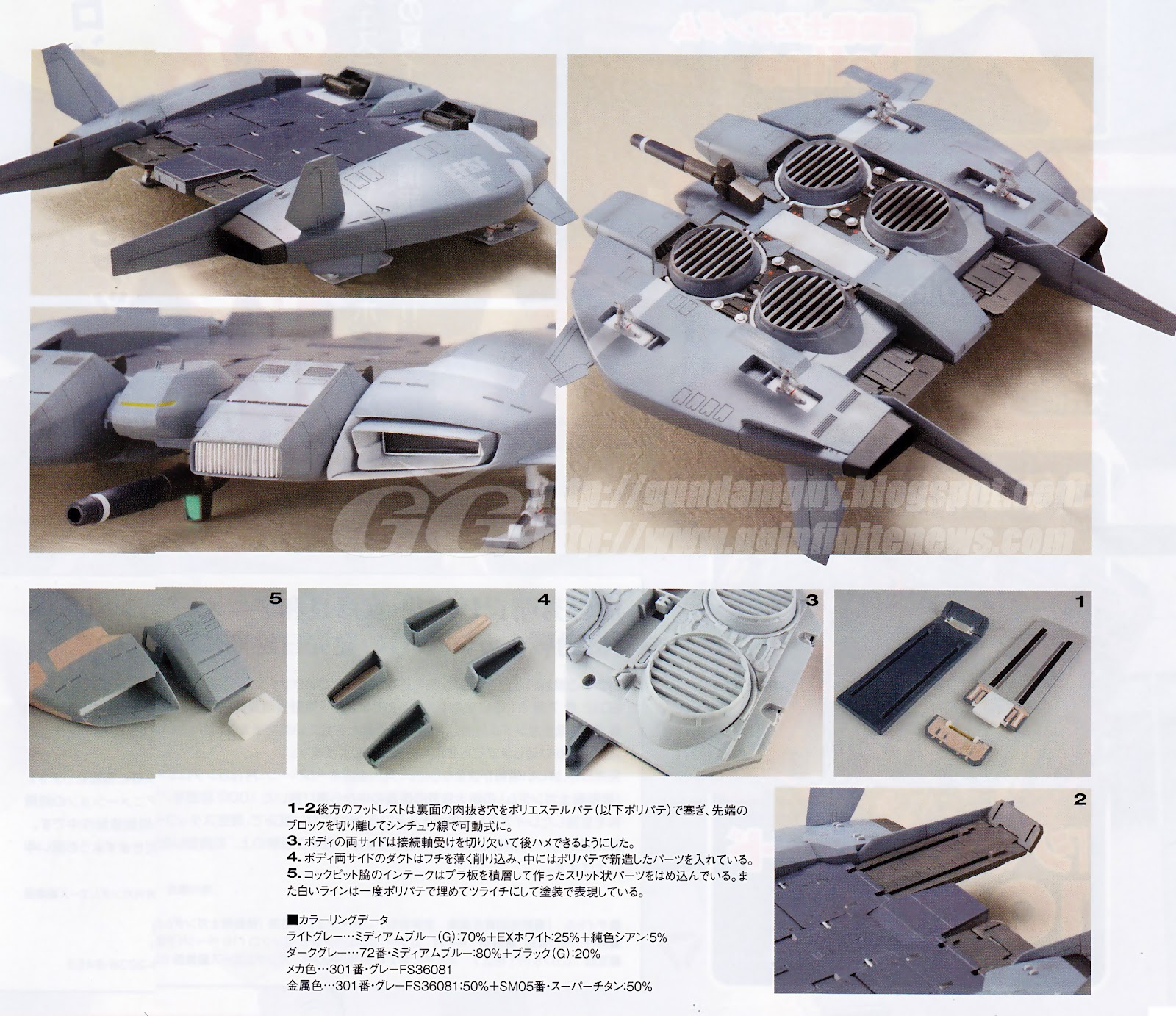 That's right, I'm revisiting this Nemo project. In the past few weeks, I considered developing a propulsion platform that the MS could "hang" from. Ideas ranged from modifying Infinite Justice's Fatum 01 lift/booster or flipping over the Base Jabber (UC OVA ver) to utilize the built in handles. On the contrary, I also want the option of mounting the Nautilus on the Nemo's back.Version 7.0 is inspired by ReGZ's back weapon system (BWS), which is a back mounted weapons platform that converts the unit into a waverider-like mode.